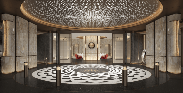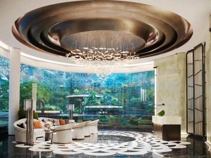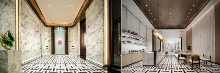 入户大堂以传世珍宝的形式呈现,抵达门厅两侧镶嵌水晶艺术灯具的奢石墙体,精心雕琢的艺术玻璃门开启奢享的体验,整体空间通过优雅的弧形石材墙面与金属结合,呈现奢华与优雅并存。