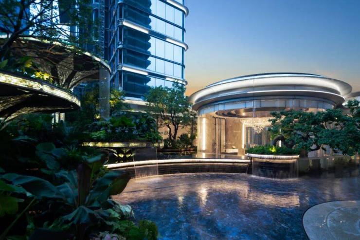 将飞瀑景观引入室内,建面超600m²、挑高约28米的天际双塔超规格入户大堂,构筑归家专属符号,匹配高净值人群身份。