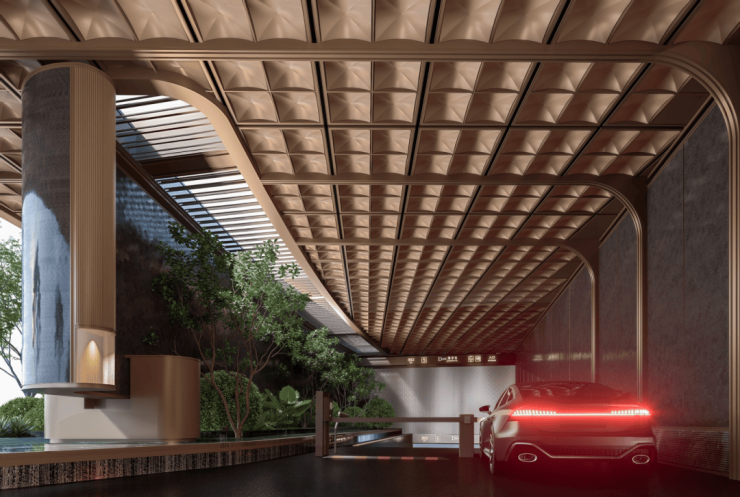 打造3个车库出入口,7米双车道,地库入口旁均设计储藏室,同步配置司机休息室;车库全奢装理念,坡道出入口采用石材墙面+不锈钢星空顶设计。地库车道采用金属网+透光云石灯设计,车道地面采用无机磨石地坪,耐久性光泽度及平整度好,车道立柱采用岩板外包。