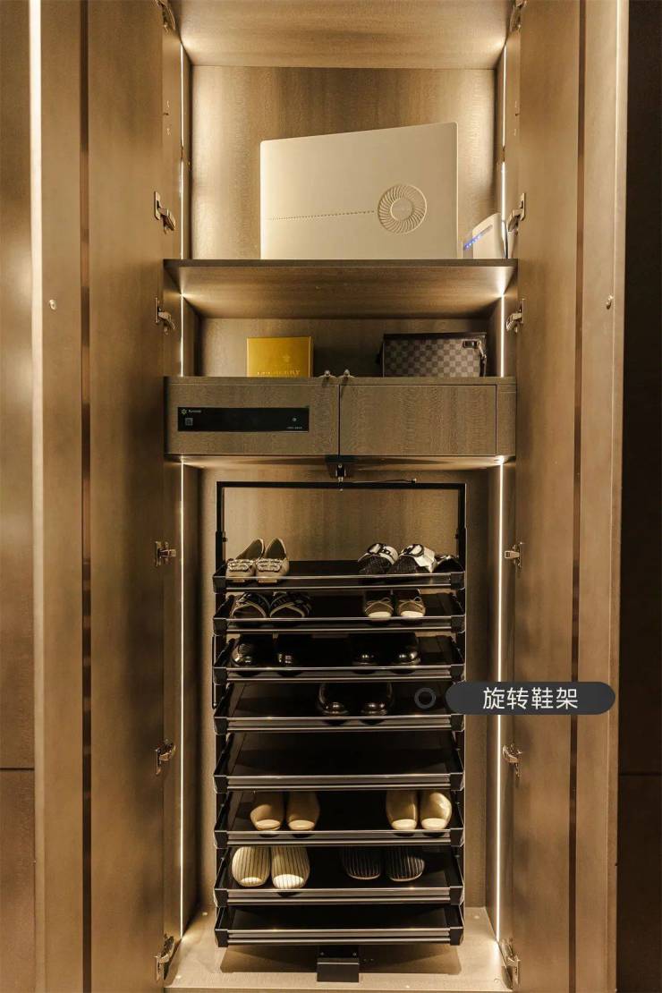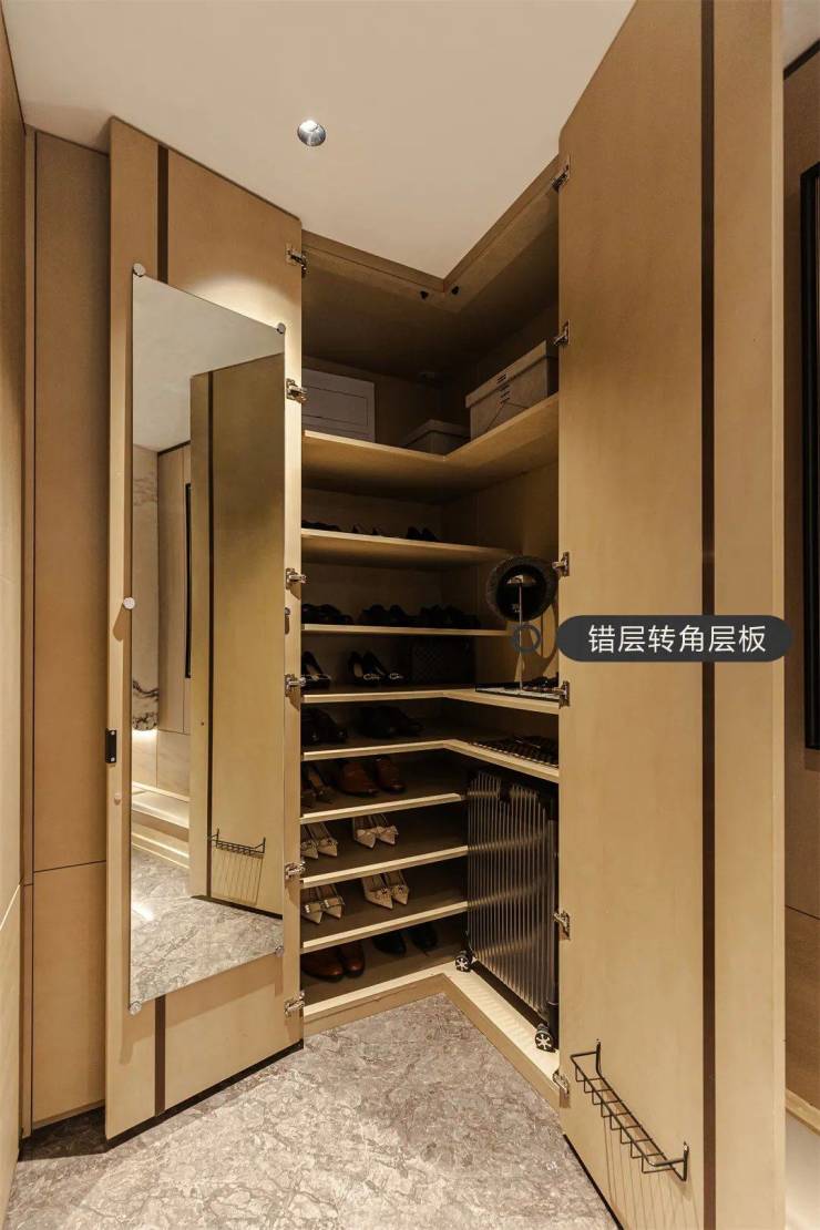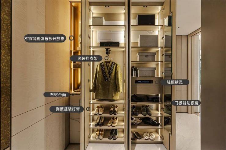 高定生活,藏于细节。不锈钢圆弧背板开放格、侧板竖装灯带、石材台面板,将美学与工艺完美糅合。竖装挂衣架、鞋柜精灵、门板背贴银镜、旋转鞋架、错层转角层板等设计,处处体现着对生活方式的解读。