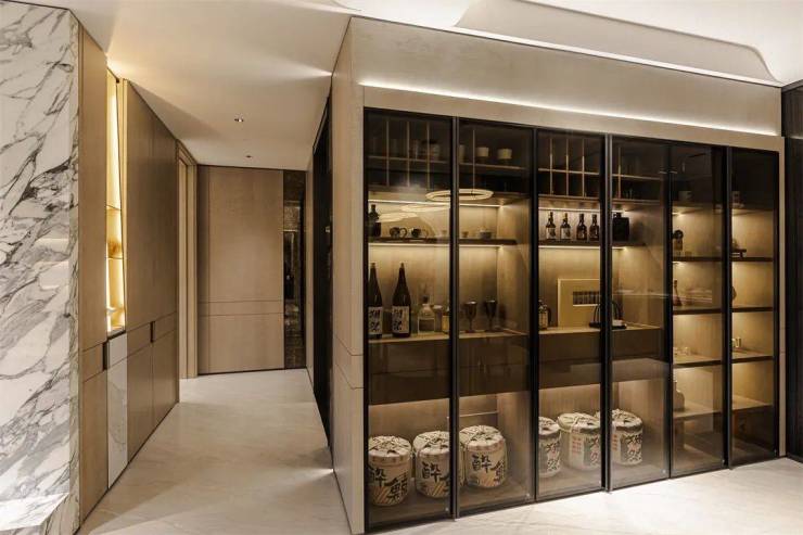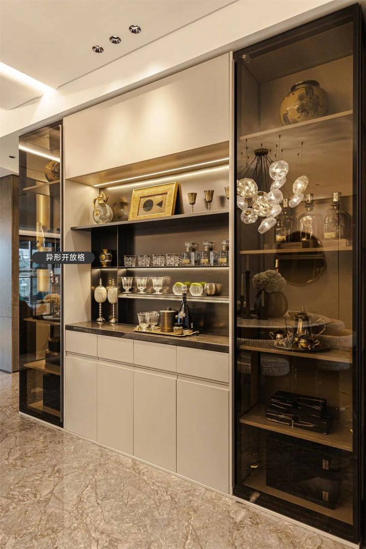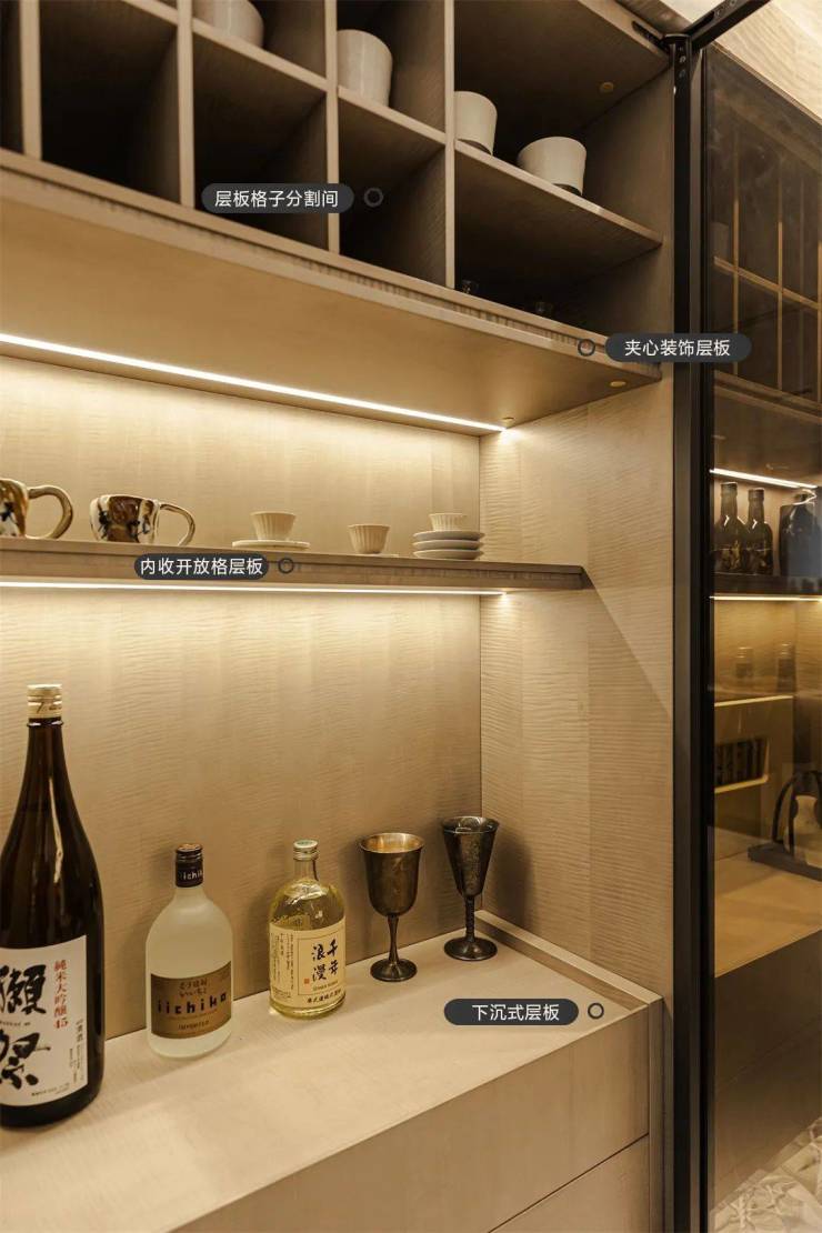 ▲建面约159㎡·不锈钢开放格+深色茶玻门酒杯收纳柜