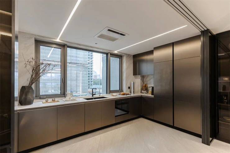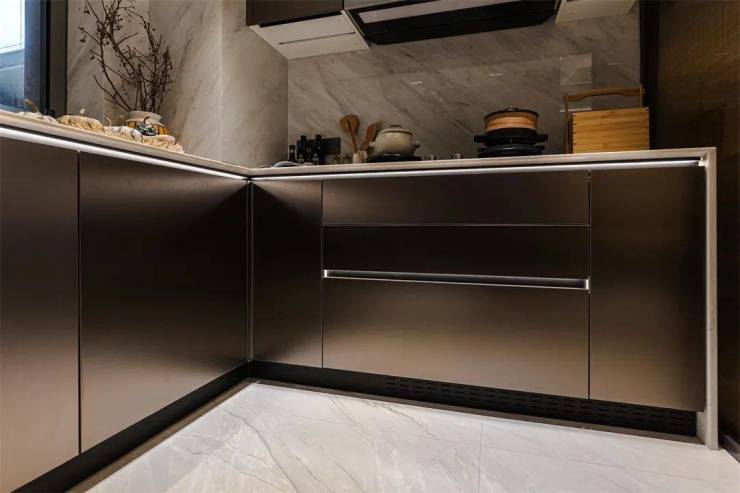 整体厨柜线条流畅,简约高贵,独特的金属光泽,蕴藏着不露锋芒的高级感,让空间散发出独特的气质。