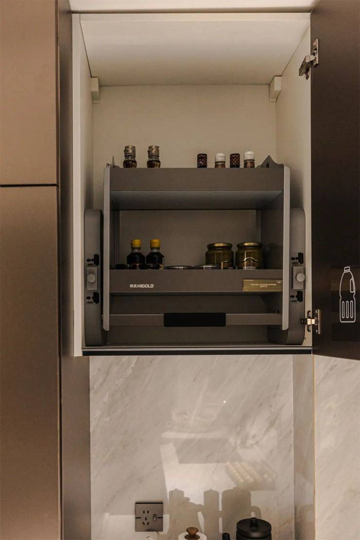 收纳设计:转角空间精细收纳、吊柜下拉拉篮收纳、餐具收纳、调料收纳、嵌入式电器,让厨房里的每一件物品,都有专属的摆放位置。