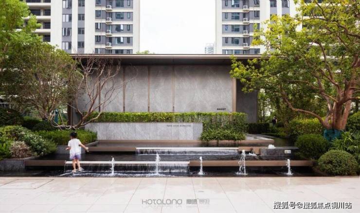 中轴对称的丛生乌桕列阵而立,其下黑色石材座凳静默延伸,将自然的庄重与人文的栖居融为一体。轴线尽头,跌水轻击石板,景墙如静立之屏——一侧红叶灼灼似火,一侧造型松枝舒展如迎,在光与影的交织中勾勒出一幅流动的画卷。这一刻,艺术与自然相融,时光与空间共鸣,开启了心归宁静的诗意旅程。