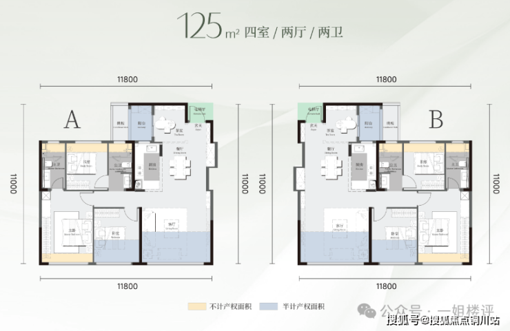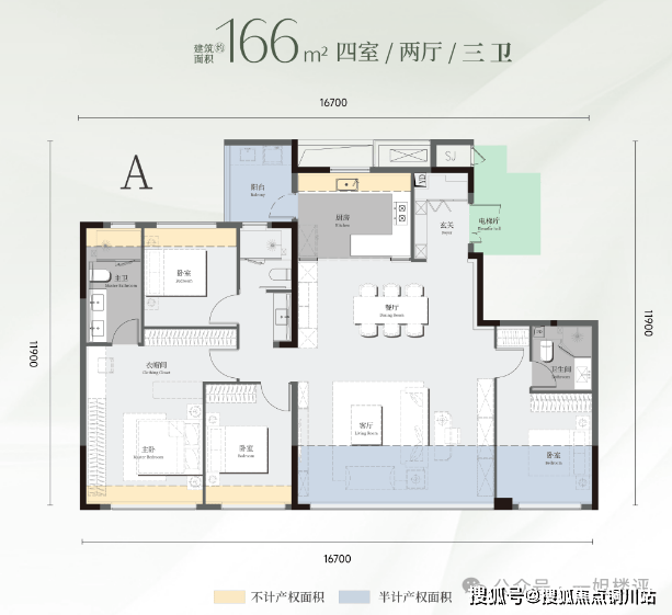 最大户型是建面约166平四房两厅三卫,这个户型也有两种结构。