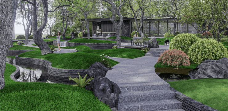 而桂语新著的水系,形成了一座游岛,通过效果图可以看到:游岛之上,林荫之下,仿佛自然天成的森林绿岛,是比城市公园更精致的存在。