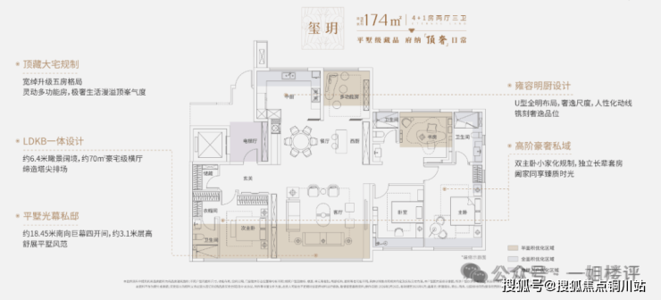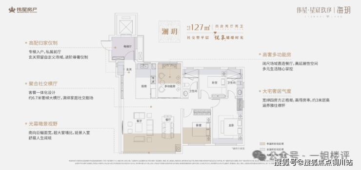 4+1房两厅三卫,超18米南向巨幕开间,约70平墅级横厅,中西双厨、阔绰双套房,独立储藏间,完全是建面约200平以上顶级大平层才有的配置。