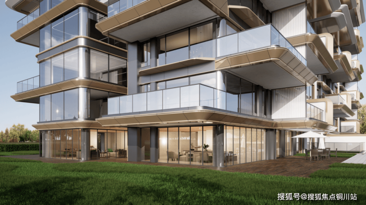 建筑通体主要为香槟色,立面以两层为单元进行统一设计,呈现出整体主次分明,挺拔向上的建筑形象。翼板尺度纤细,线条顺滑,出檐深远,质感细腻,立面充满未来感的同时又不失家庭应有的温和元素。