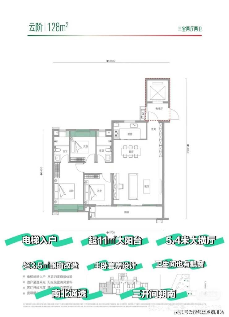 连廊边户解析:128平3房2厅2卫(下图)。虽然不是横厅,但是客厅还包了一个“书房”进来,客厅的宽度是足够的,通透性非常好。比较优质的大三房户型。