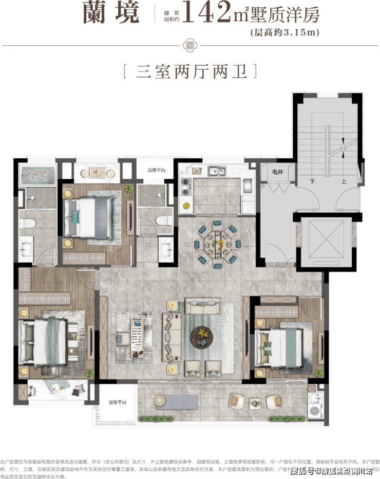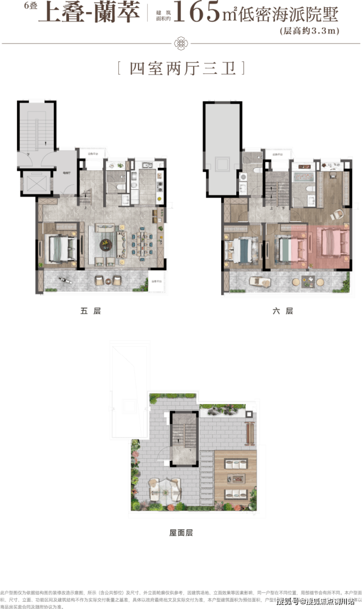 建筑面积约165㎡六叠上叠,四室两厅三卫,三层独立私梯入户,LDKB一体化,约6.6m面宽横厅直连宽境阳台,四套房式主卧,自带独立卫浴、衣帽间,约9.8m面宽南阳台,拥抱松弛心境,顶层超阔露台,对望星空、闲观河岸,万千雅趣自成天地。