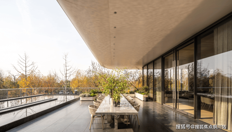 曲线感的挑檐层层叠叠,绿植、小瀑布点缀其间,超大玻璃幕墙引光入室... 阳光、流水、绿意、光影交织,简直像个充满生命力的艺术装置!