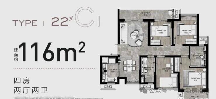建面约115-116㎡,四室两厅两卫:五开间朝南,做到了四房设计,两个阳台,在三代住宅中,属于功能性很强的户型了。需要注意的是,这个户型所在的楼栋是品字形结构, 虽然该户型是边户,但是会被中间户遮挡。