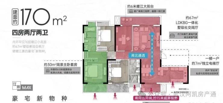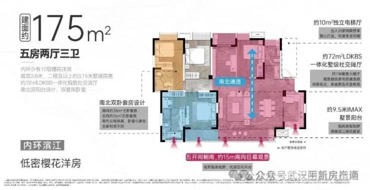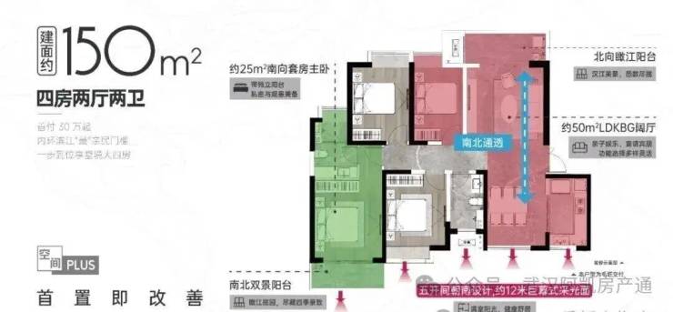 建面约150㎡全通透边户大四房,五开间朝南格局,约12m南向大面宽;北向瞰江阳台,滨江美景尽收眼底;约50 ㎡LDKBG一体社交阔厅,居住空间自然更奢阔;约25 ㎡南向主卧套房,关上门就是属于自己的“小家”,全家和而不同,各享独立的精神世界。