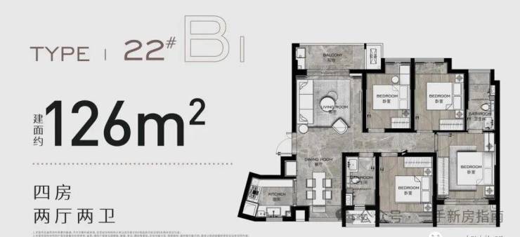 建面约126㎡,四室两厅两卫:该户型与116㎡户型结构比较类似,但该衔接阳台的次卧改为了飘窗,舒适度要高一些。该户型同样存在被中间户遮挡的问题。