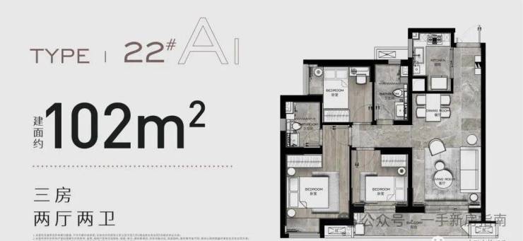 建面约102㎡,三室两厅两卫:三开间朝南的小户型,在老三代楼盘中,这样的面积能做成三房两卫,功能性还是可以,不过北侧次卧以及厨房的采光一般。