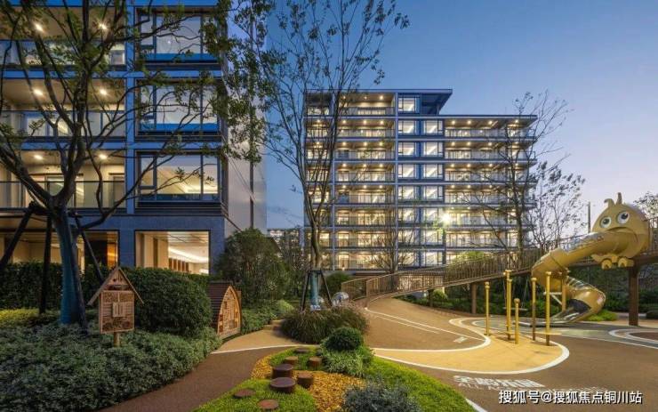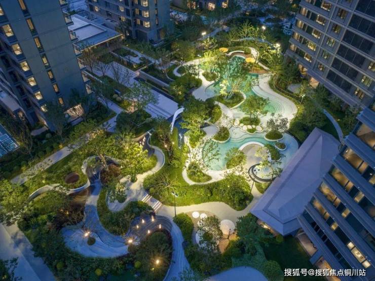 层层叠叠的园林里,还布局着儿童游乐区、健身区、错落有致的叠水景观等。