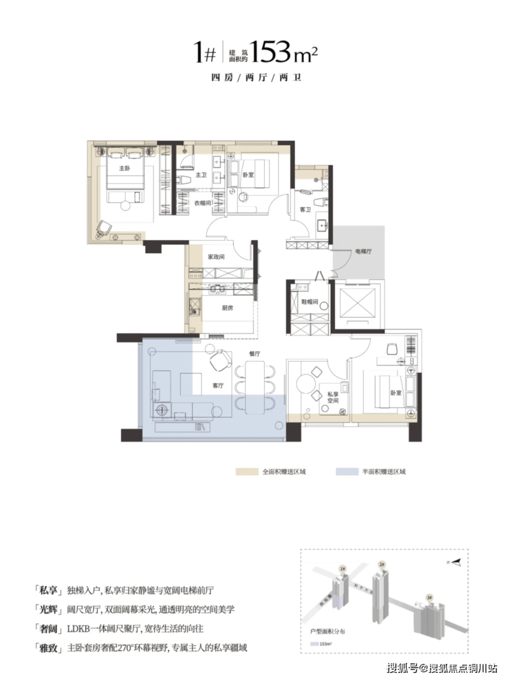 该户型为1号楼高层西边户,和建面约153㎡整体布局一致。