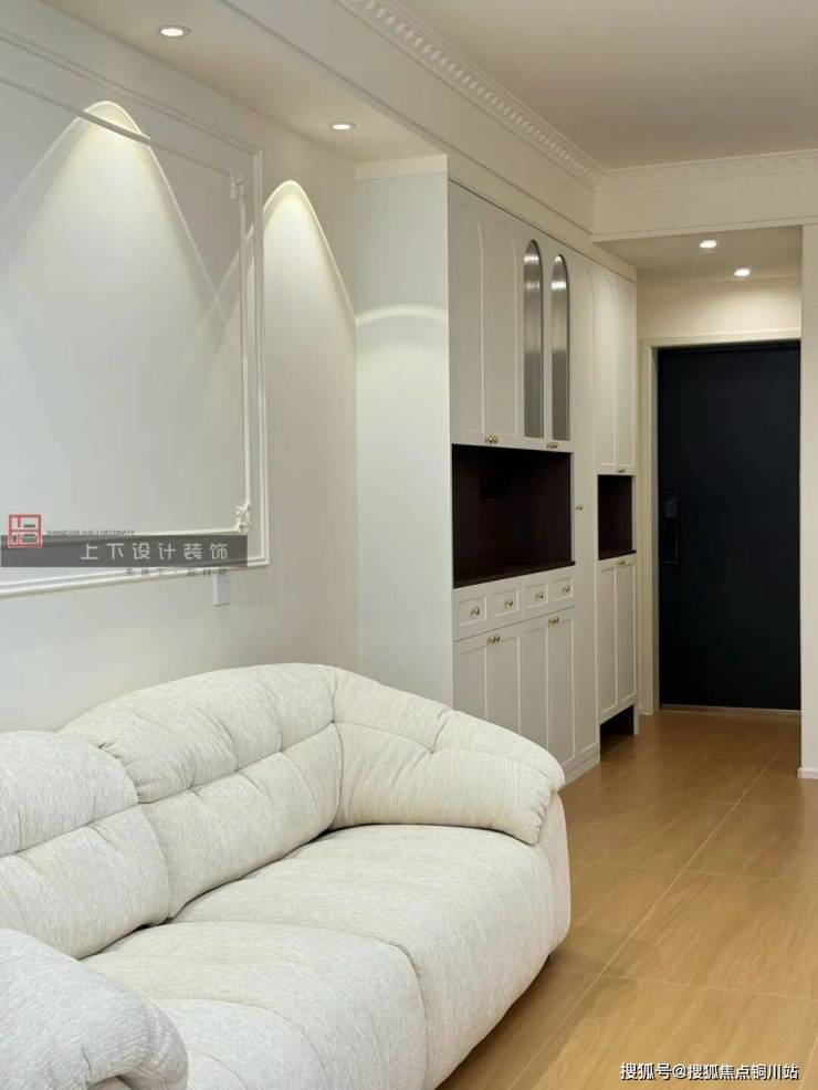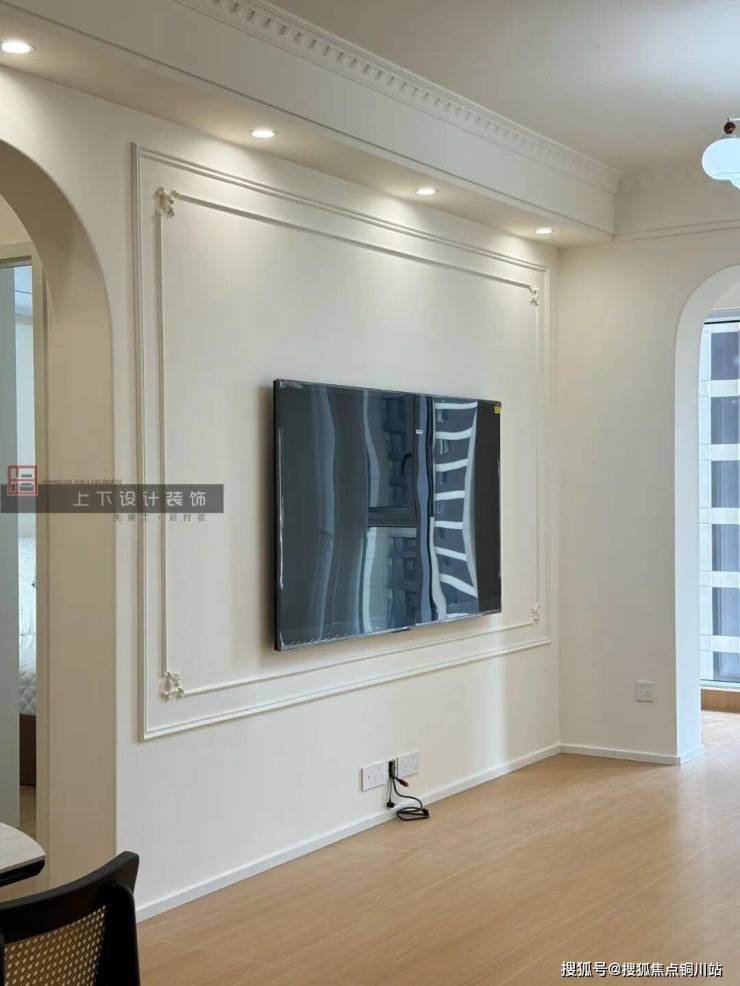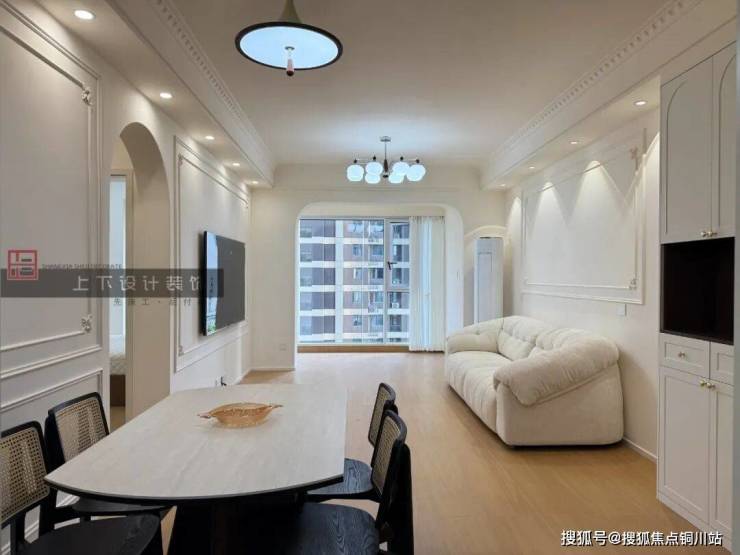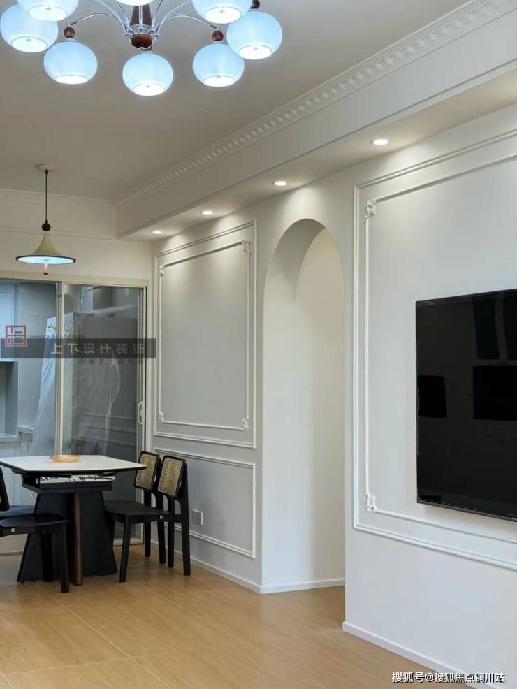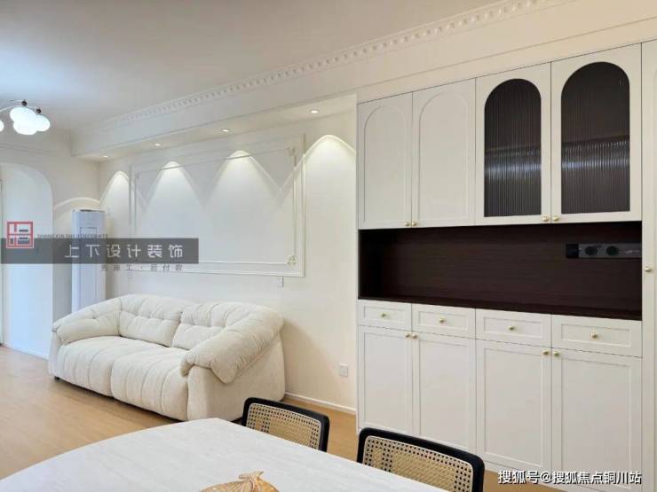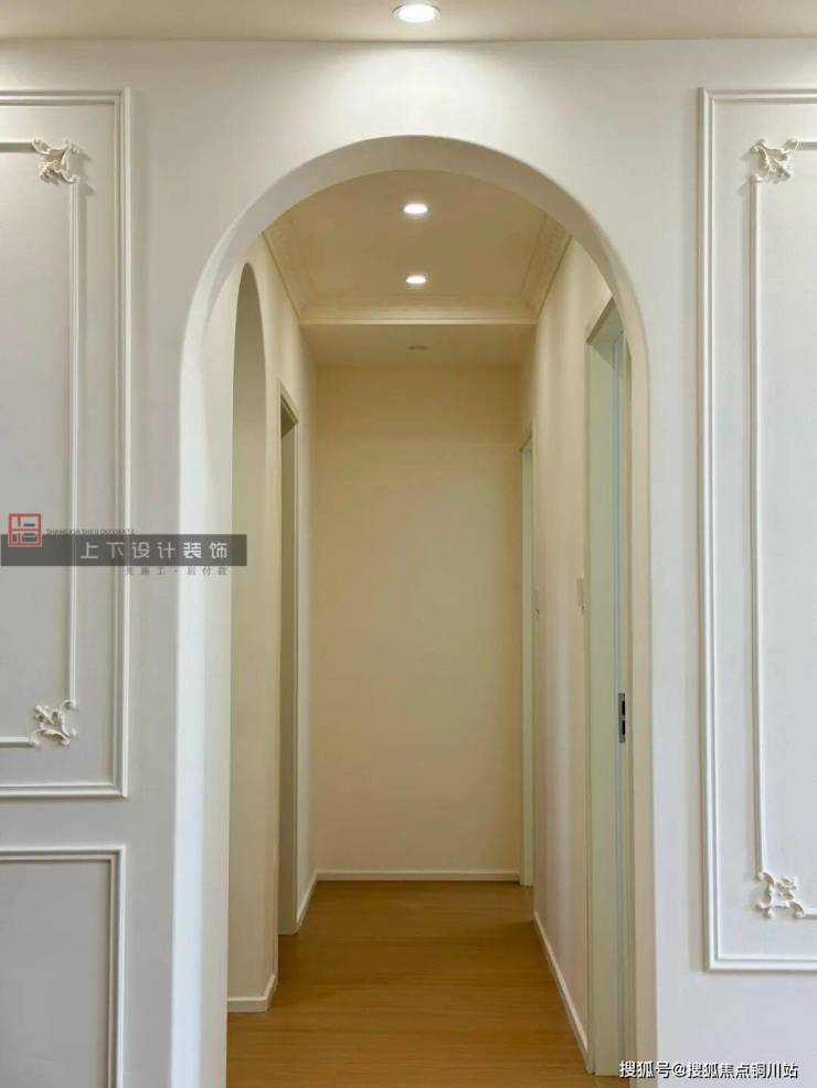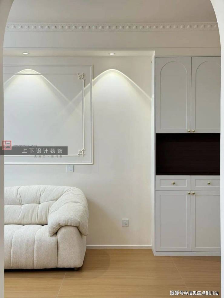 地面全屋通铺600*1200木纹砖,顶面虎头线+筒灯边吊+主灯的组合来满足照明,墙顶面乳胶漆变色通刷,整体的色调以暖色为主。墙面法式线条点缀增加层次感,户型的门洞造型柔和视觉的同时把法式的温润凸显出来。柜子的整体的色调也以胡桃木搭配奶白色为主,有层次又显质感,弧形的柜门造型和门洞造型形成呼应,金色的拉手更显质感。