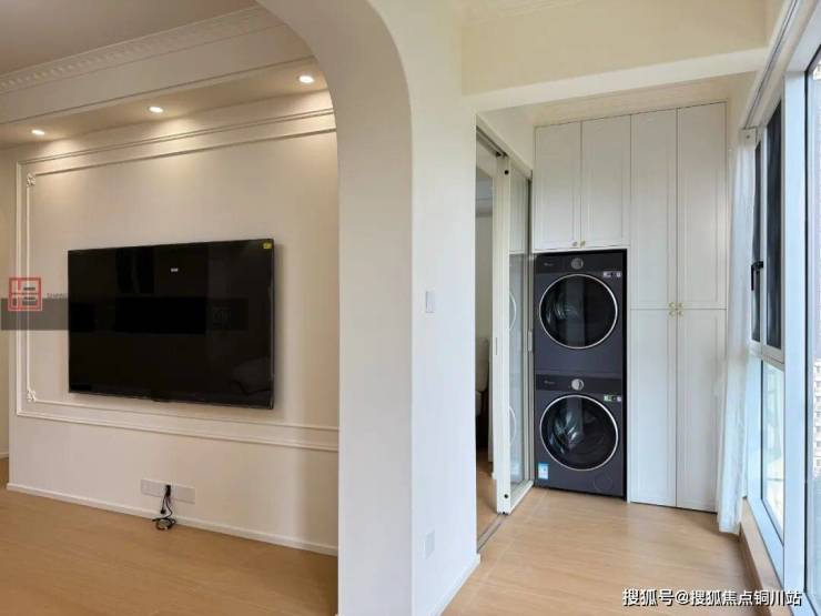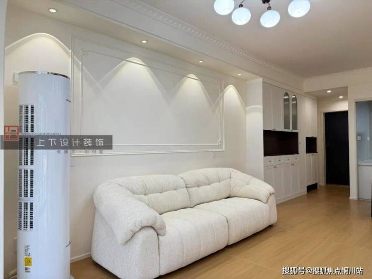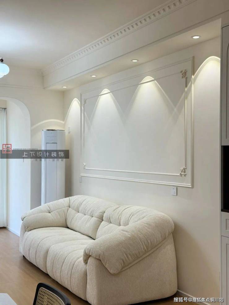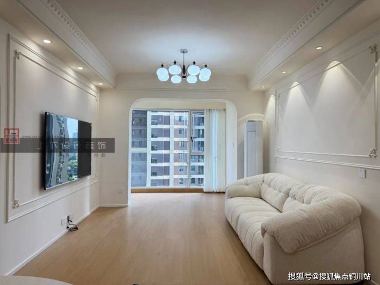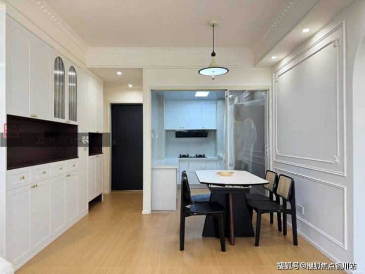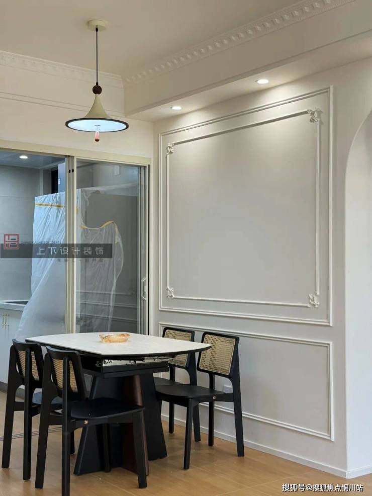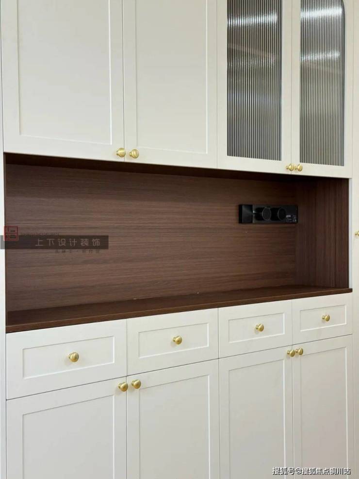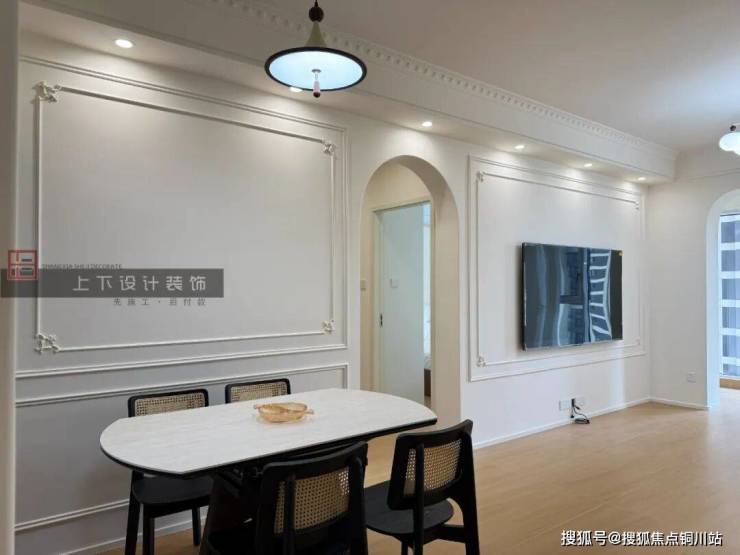 地面全屋通铺600*1200木纹砖,顶面虎头线+筒灯边吊+主灯的组合来满足照明,墙顶面乳胶漆变色通刷,整体的色调以暖色为主。墙面法式线条点缀增加层次感,户型的门洞造型柔和视觉的同时把法式的温润凸显出来。柜子的整体的色调也以胡桃木搭配奶白色为主,有层次又显质感,弧形的柜门造型和门洞造型形成呼应,金色的拉手更显质感。