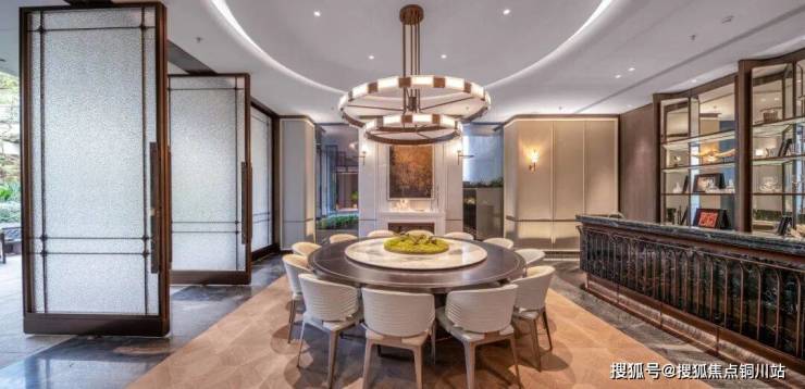 温润的尼克石墙面,与落地窗外的园林相映成趣,水纹玻璃屏风营造出朦胧雅致的光影效果;天然奢石吧台与上方的层叠透光石吊架,共同构筑了一处兼具艺术性与功能性的社交场。