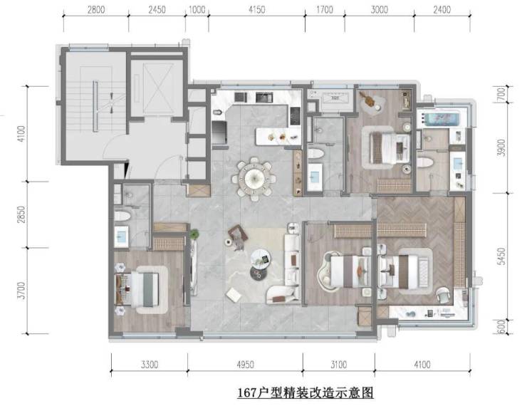 整个地块呈现凹字形,一共四楼,3栋17层小高,1栋5-7层的洋房,两种户型,143和167平。