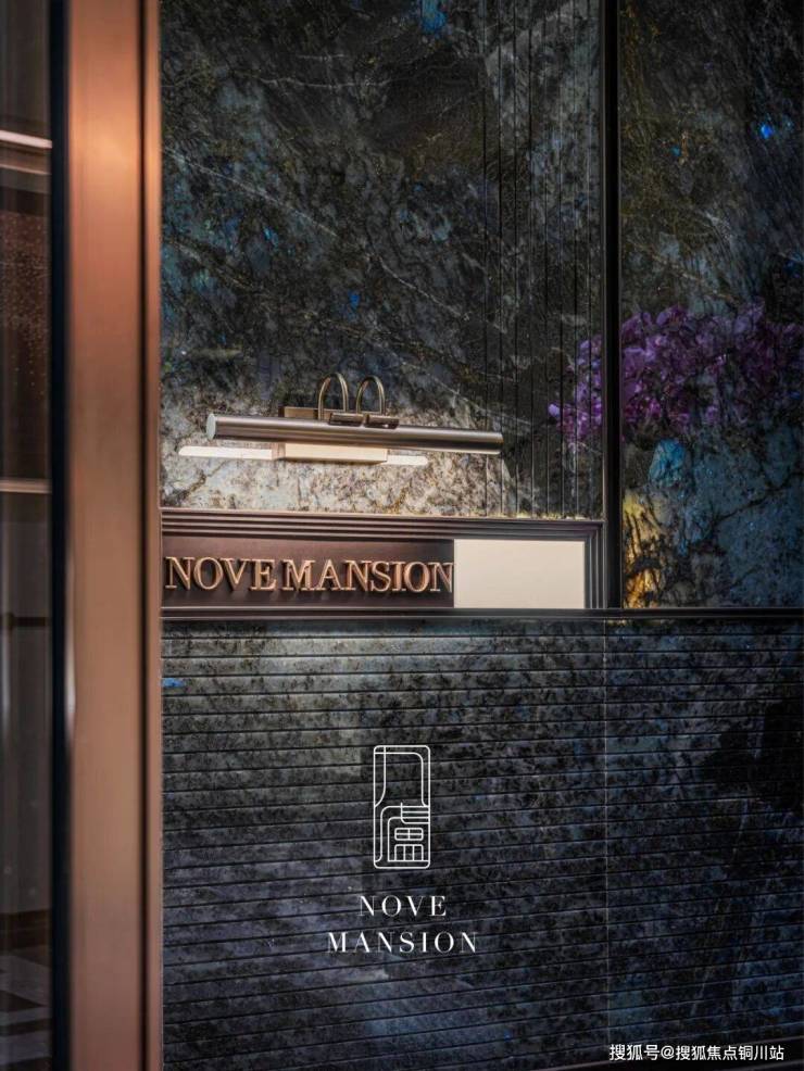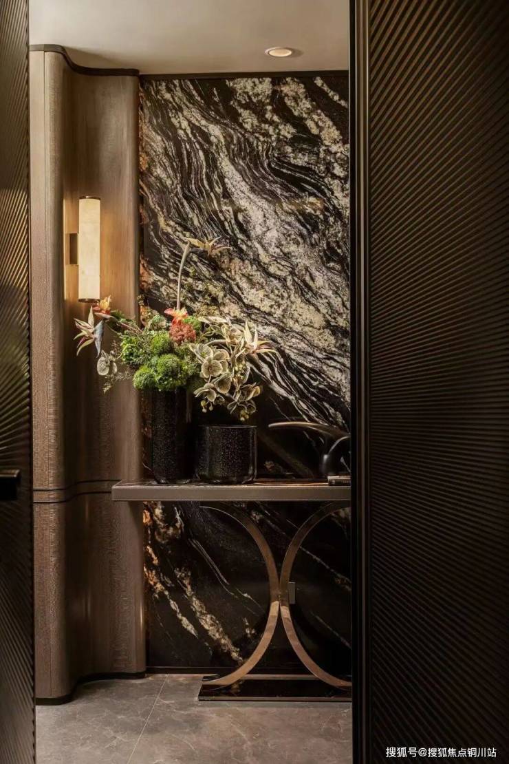 背景墙选用来自意大利的百万级蓝翡翠奢石,作为点睛之笔。这种奢石的表面布满蓝色水晶斑般的独特肌理,随着观赏角度的变化,纹理与底色之间的明暗对比不断更迭,成就九庐对艺术之美与归家之境的极致刻画。